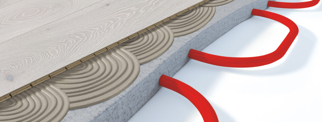 Two installation methods can be used with underfloor heating: the floating system and the glue-based system, where the boards are glued to the substrate.