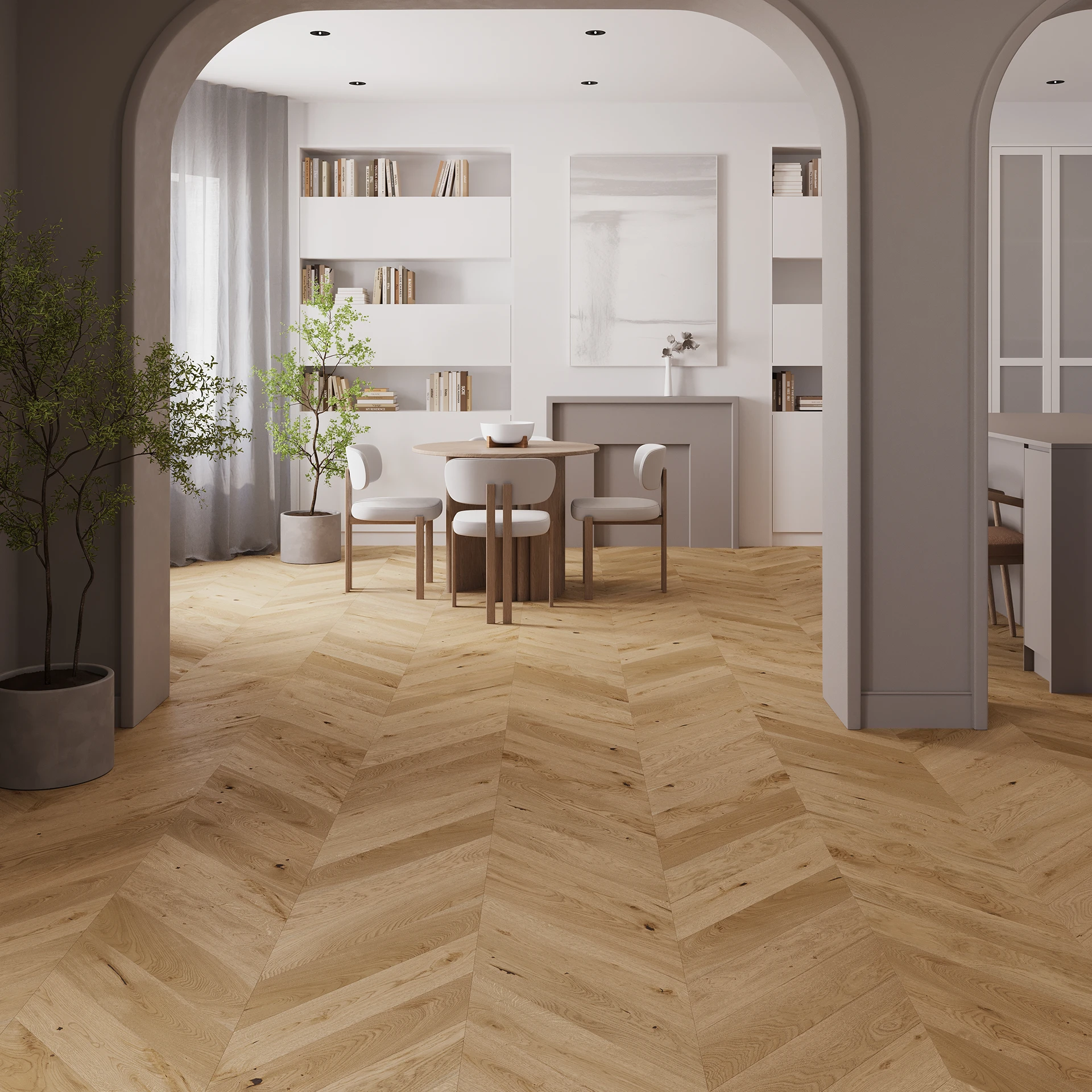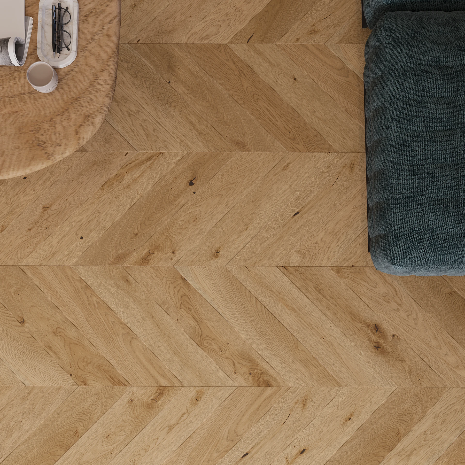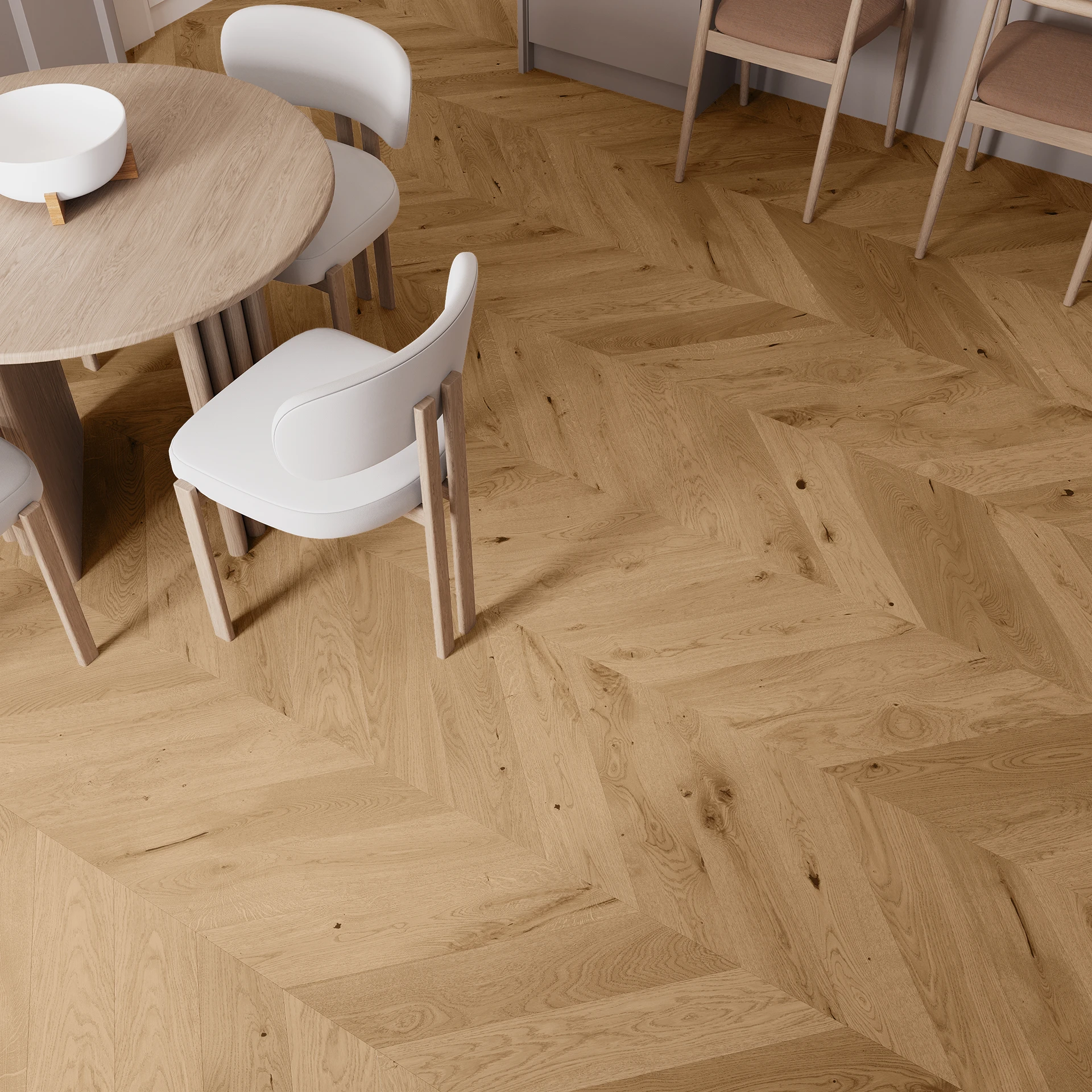 An oak board with strongly exposed wooden characteristics and a pleasant shade of warm brown. The floor was brushed and chamfered to emphasise its structure and form. It is finished in matt lacquer.