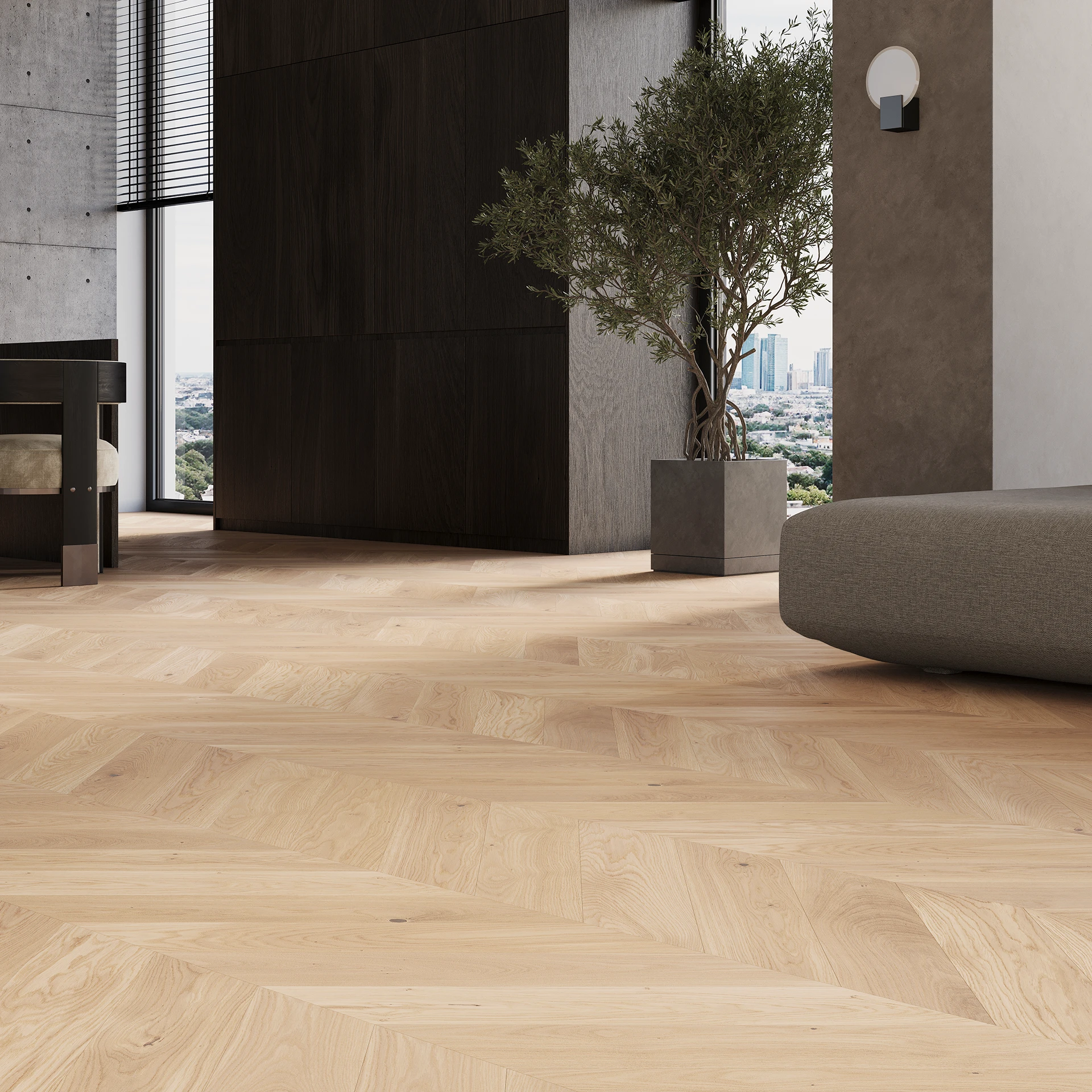 Oak floor in a delicate white colour. The floor is slender and delicate thanks to four-sided micro-bevel, and the unique wood pattern is emphasised by brushing. It is coated with natural oil.