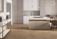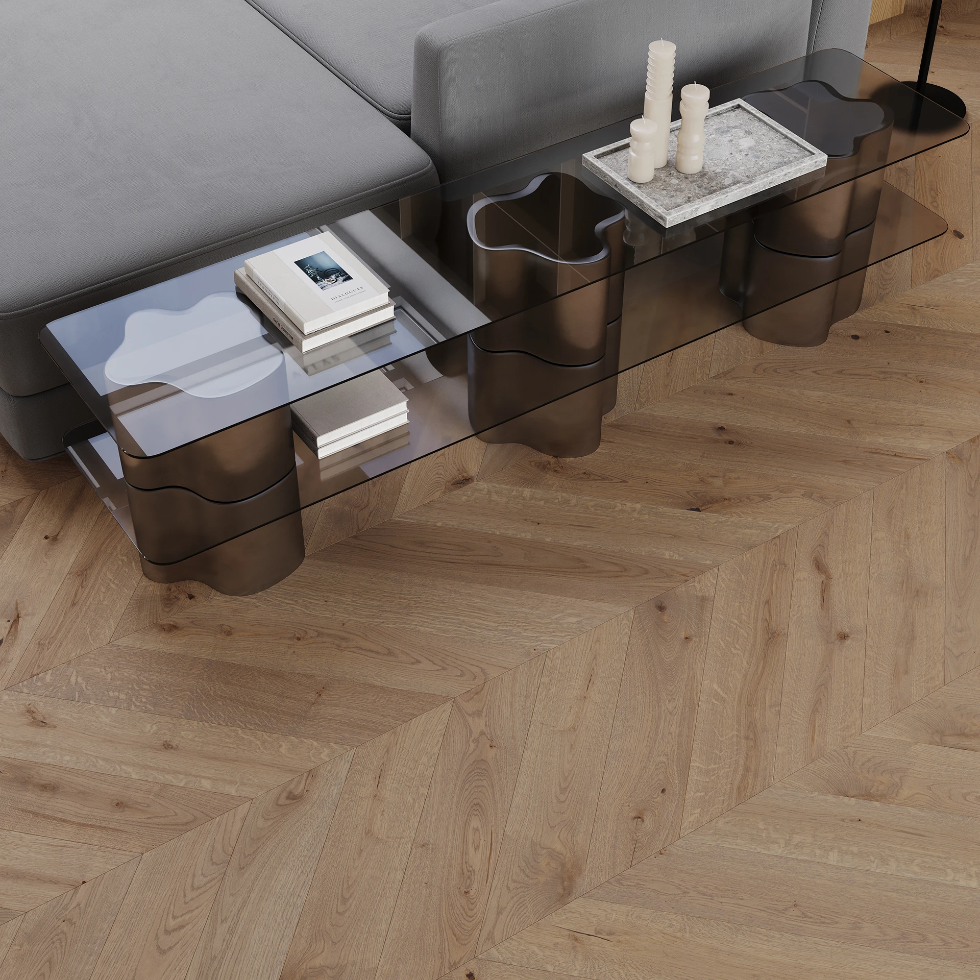 Wooden flooring with a structure that is strongly emphasised by brushing, with lots of natural wooden characteristics. The 4-sided micro-bevel gives the boards an additional authentic appearance. The floor has a beige-ashen colour and it is finished with matt lacquer.