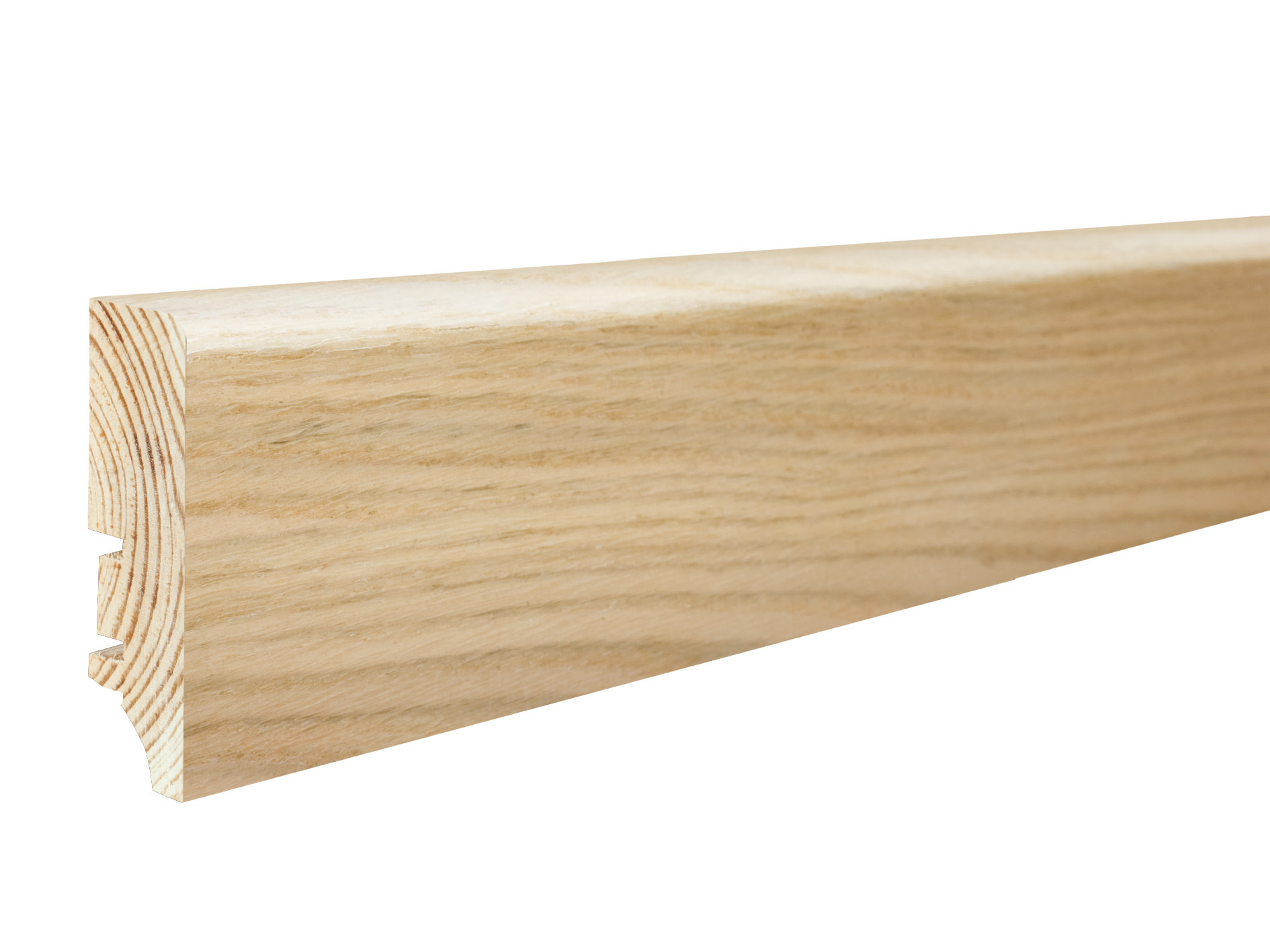 The Whitewashed Oak skirting board is finished with a layer of hardwood in a precisely defined shade, sourced from carefully selected timber. It is extremely durable and highly dimensionally stable. Thanks to the milled channels for electrical cables, it is very functional while maintaining a neat and elegant appearance.