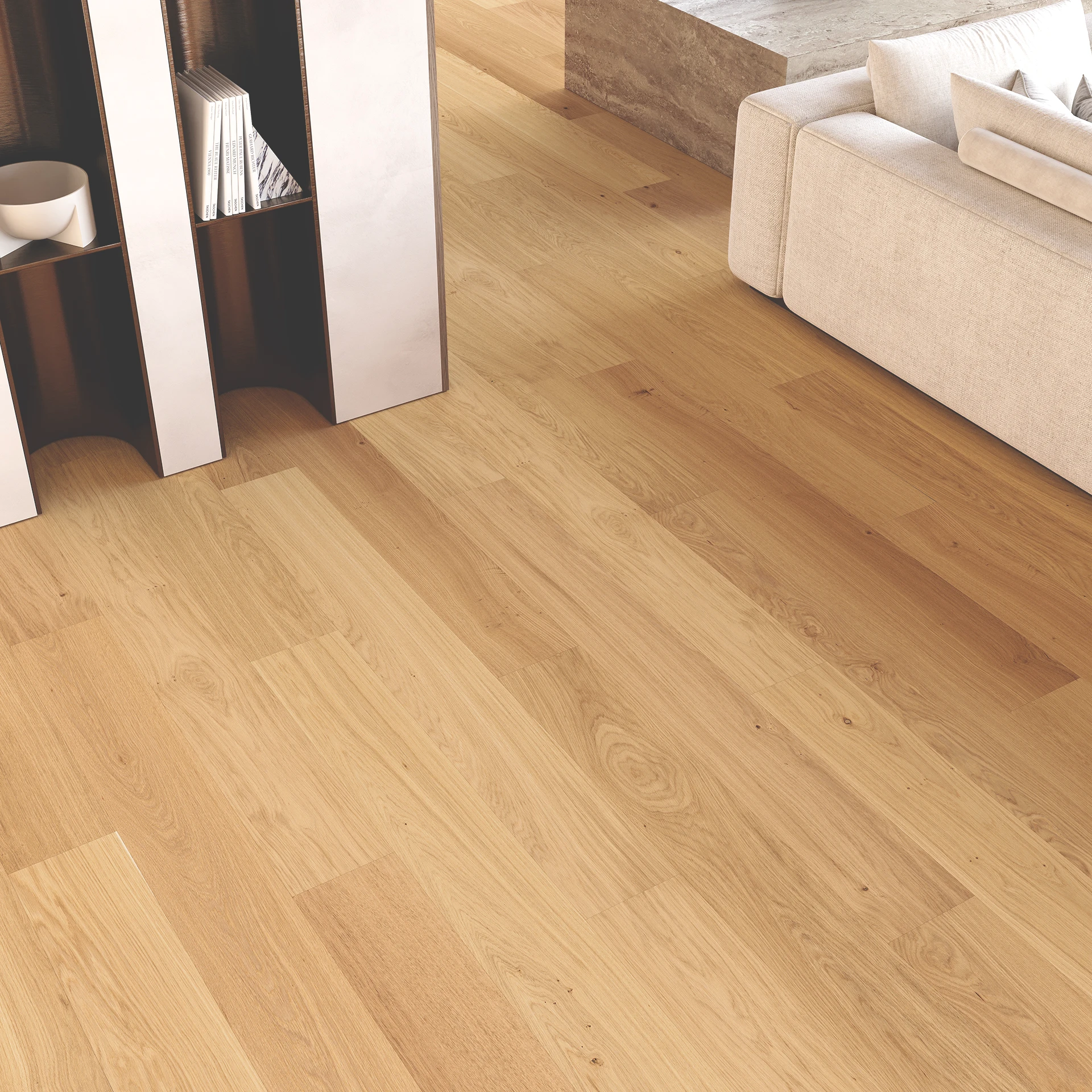 A natural oak floor with subtly highlighted wood features. The brushed surface beautifully accentuates the grain pattern, giving the floor an authentic character and a refined look.