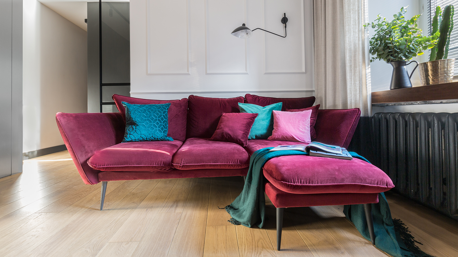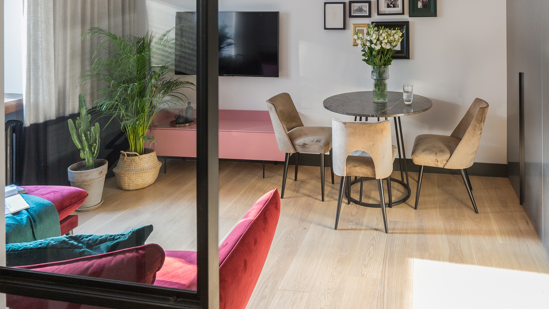 Red, fuchsia, bottle green, sea green, and yellow—these are very bold colors that can sometimes be challenging to incorporate into interior design. However, that doesn’t mean you have to give them up. The interior of the Decoroom office project. The floor features Barlinecka Oak Gentle planks.