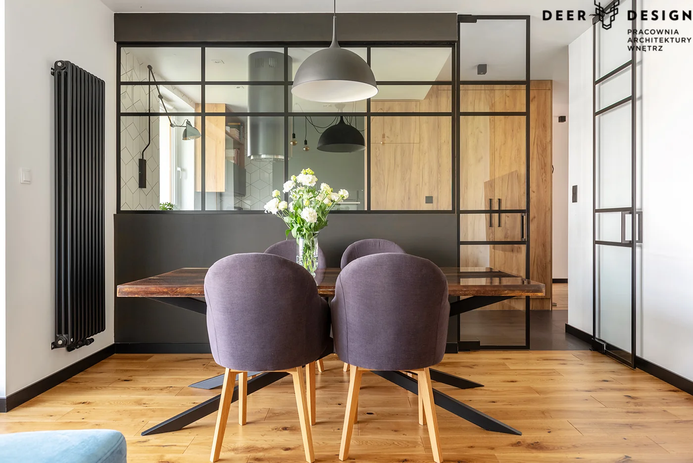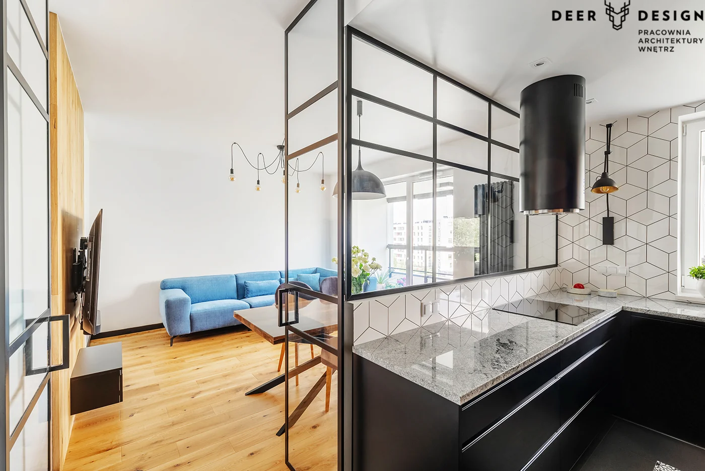 A living room with an open kitchen is becoming an increasingly popular solution, especially in small apartments. This layout brings more space and light into the interior. The kitchen and living areas can be fully integrated or separated, for example by an island or glass partitions, as seen in this project by Deer Design. The warmth of the modern interior is provided by the Barlinek Raisins Grande Oak flooring.